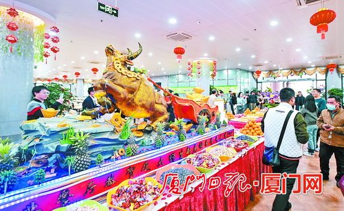 廈大:從芙蓉湖撈起千斤魚 為留校學生烹年夜飯 廚師用泡沫塑料雕金牛。(記者林銘鴻攝) 廈大食堂昨天開足“馬力”,為史上最多的留校學生烹制年夜飯,其中的酸湯魚、麻辣魚來自自家“魚塘”。…