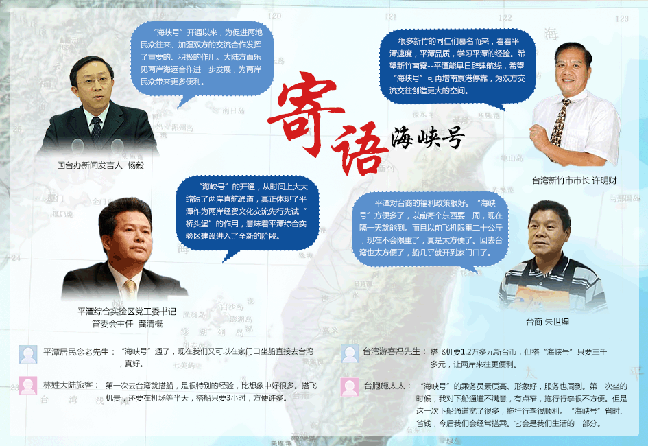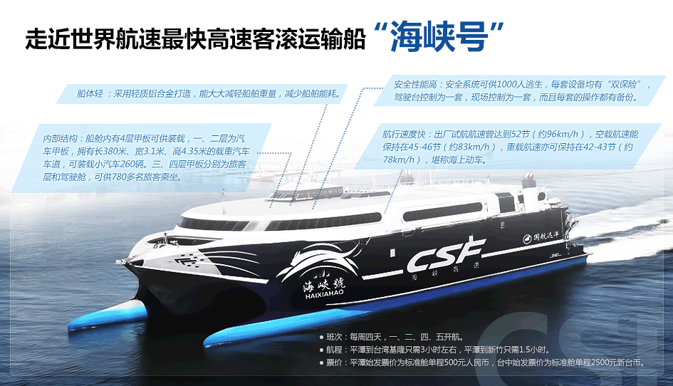 “海峽號”作為聯系平潭綜合實驗區這方熱土與寶島台灣的主要交通方式,承載著溝通兩岸政治交往、促進兩岸經濟往來、維系兩岸民間交流的重大使命。有道是“海峽”跨兩岸,惠風出平潭,“海峽號”乘風破浪,平潭正駛向建設兩岸共同家園的偉大航標。