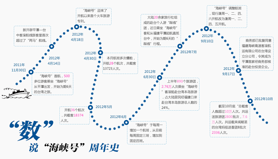 自2011年11月30日首航的那天起,穿行於平潭與台灣之間的“海峽號”通航已經滿一周年了。從第一個航班的載客500名,到截至2012年10月底總載客人數超過10萬人次,短短一年間,“海峽號”航線已經成為兩岸間往來的重要通道。