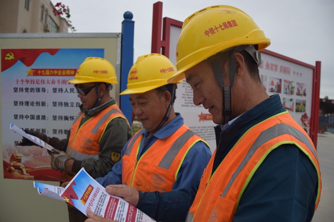 中鐵十七局集團泉州二重環灣項目職工學習貫徹黨的十九屆六中全會精神 項目一線工人正在學習。薛亞平攝