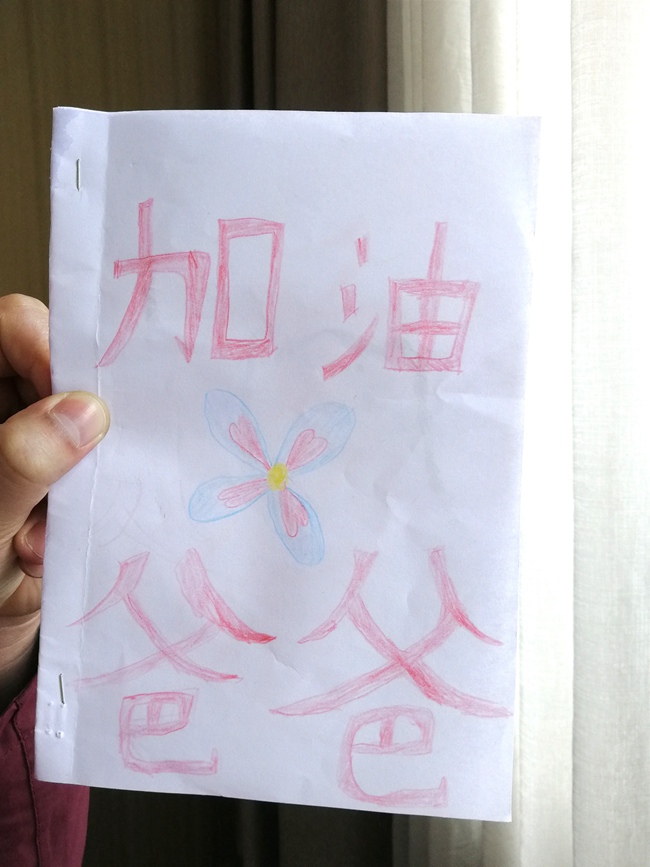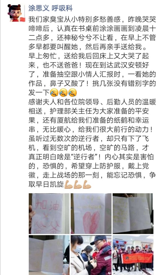 人民網福州1月29日電(葉青卿)“我們家臭寶從小特別多愁善感,昨晚哭哭啼啼后,認真在書桌前涂涂畫畫到凌晨十二點多,還神秘兮兮不讓看,說早上不管多早都要叫醒她,然后再親手送給我。早上匆忙,送給我后回床上又大哭了起來,也不送爸爸……”這是福建支援湖北抗擊新型冠狀病毒肺炎疫情醫療隊成員、福建省中醫藥大學附屬第二人民醫院呼吸科醫生涂思義在1月27日抵達武漢后發的一條朋友圈消息。