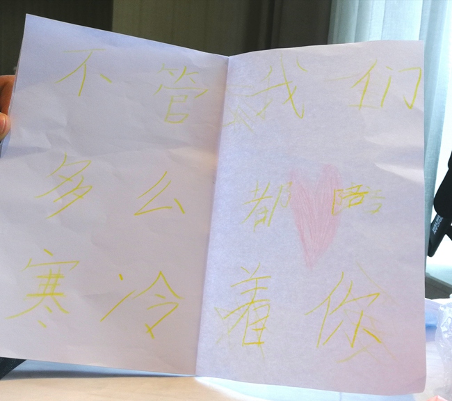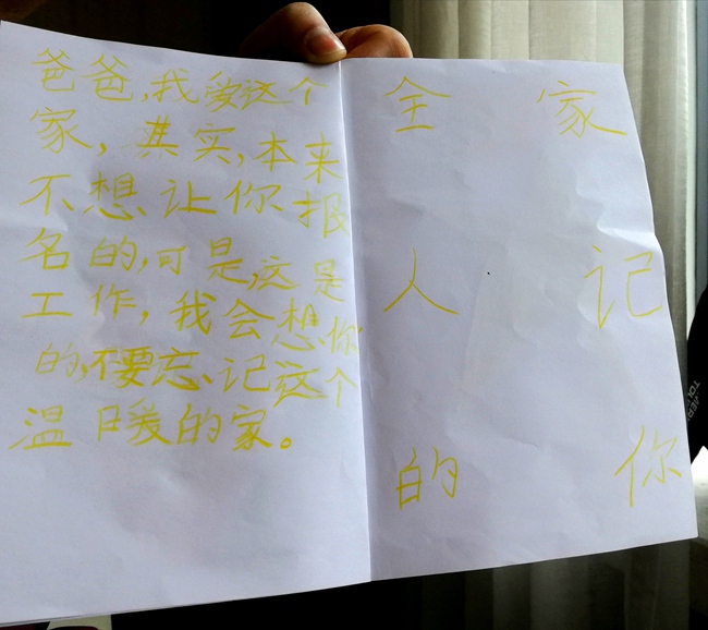 小小涂在畫本上寫道:“爸爸,我愛這個家。其實,本來不想讓你報名的,可是這是工作。我會想你的,不要忘記這個溫暖的家。全家人記得你。” 涂思義供圖