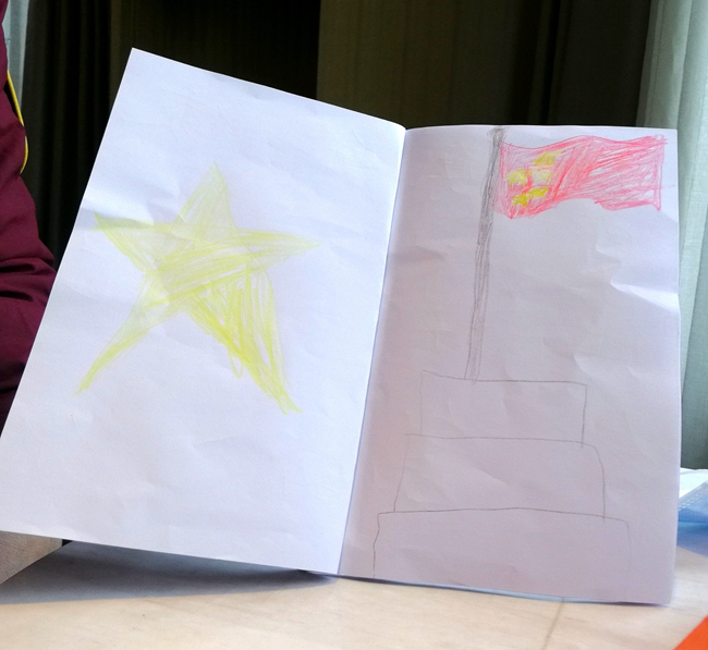 畫本的最后,小小涂畫了五角星和迎風飄揚的五星紅旗,為爸爸加油鼓勁。 涂思義供圖