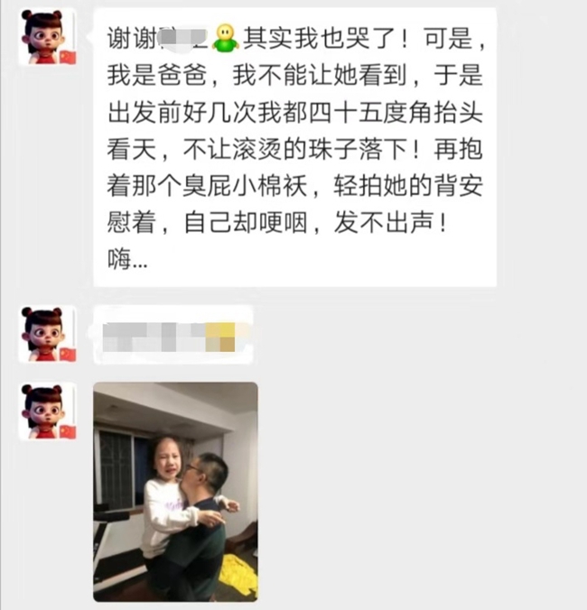 這個繪本是涂思義抵達武漢后才拿出來認真看的,他忍不住哭了。“出發前好幾次我都四十五度角抬頭看天,不讓滾燙的珠子落下!再抱著那個臭屁小棉襖,輕拍她的背安慰著,自己卻哽咽,發不出聲!”涂思義在微信上說。