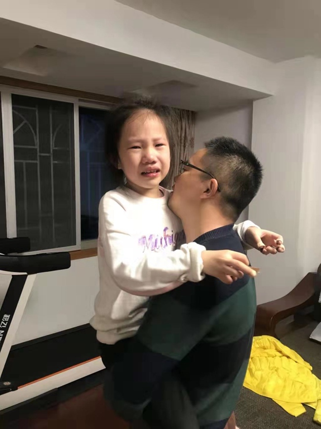 1月26日,也就是涂思義啟程赴鄂的前一個晚上,小小涂泣不成聲,像小考拉一樣挂在爸爸身上,舍不得爸爸離開。 涂思義供圖