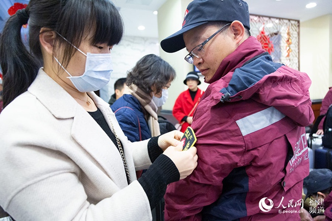 1月27日清早,福建支援湖北抗擊新型冠狀病毒肺炎疫情醫療隊啟程赴鄂,臨行前,妻子親手給涂思義挂上了出征的臂章。 焦艷攝