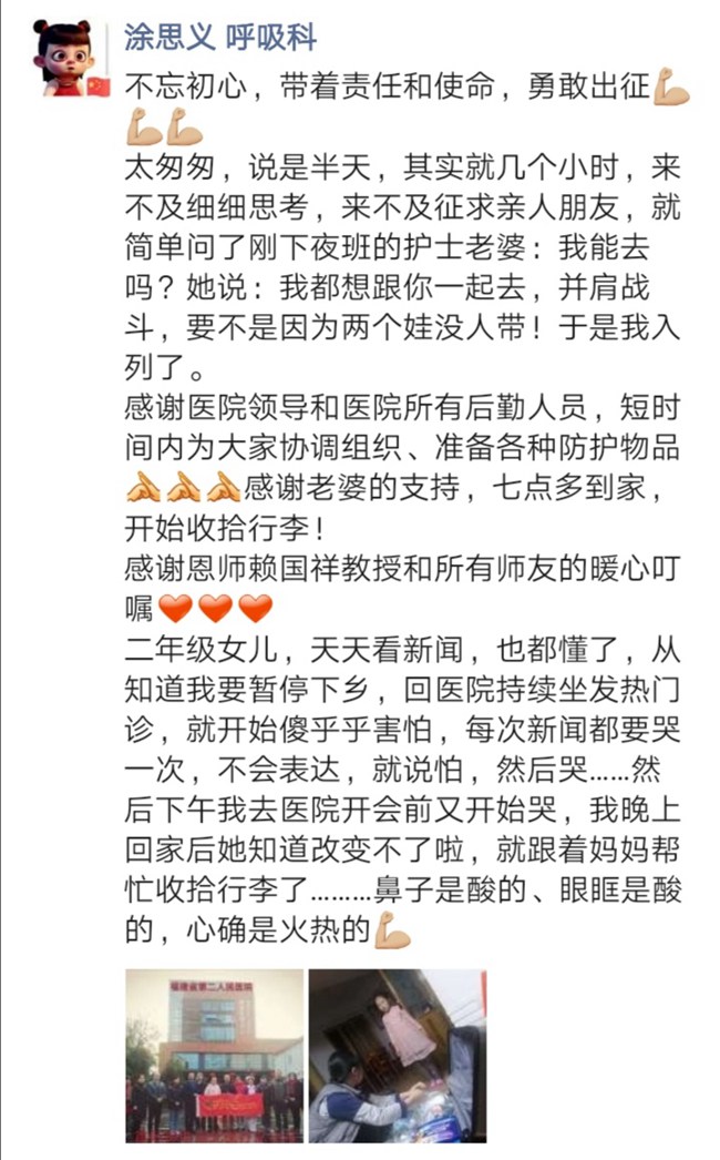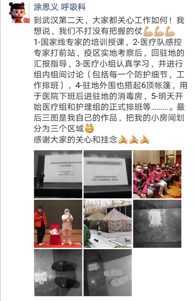 福建支援湖北抗擊新型冠狀病毒肺炎疫情醫療隊已於1月27日中午抵達武漢。涂思義被派往位於武漢市江岸區的武漢市中心醫院進行醫療支援,目前已投入緊張有序的支援籌備工作中。