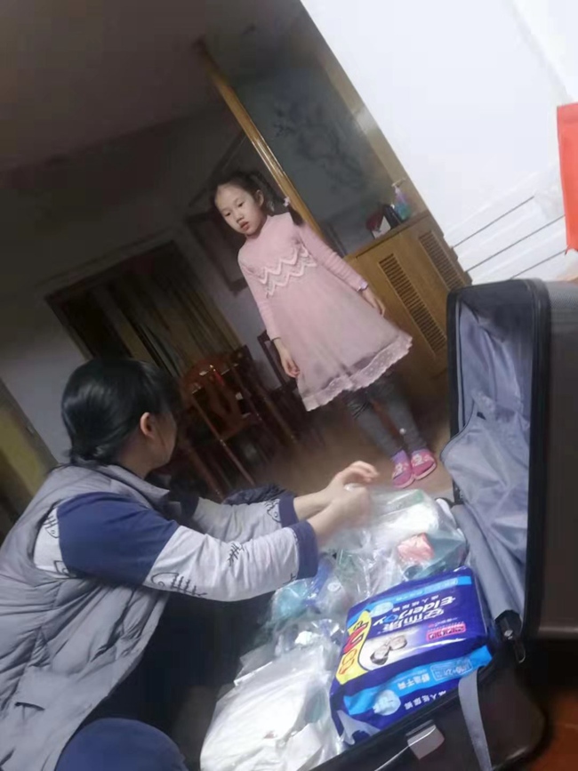 臨行前夜,妻子一邊為涂思義整理行李,一邊安慰女兒。妻子給他准備了成人紙尿褲,對即將到來的“硬仗”做好了准備。 涂思義供圖