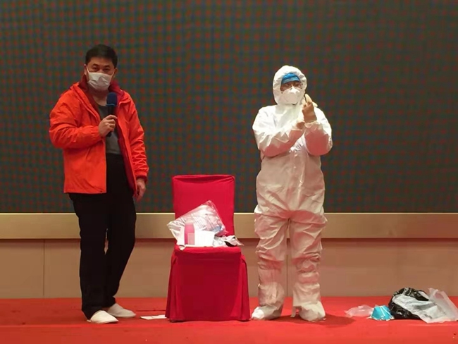 培訓課上,專家在教授如何正確穿戴醫療防護裝備。 涂思義供圖