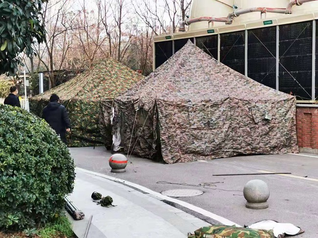 福建支援湖北抗擊新型冠狀病毒肺炎疫情醫療隊駐地外圍搭起了六頂帳篷,作為醫護人員們下班后進駐地的消毒房。 涂思義供圖
