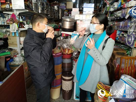 峰市鎮新坑村第一書記吳曉霞教群眾如何正確使用口罩。永定區委組織部供圖