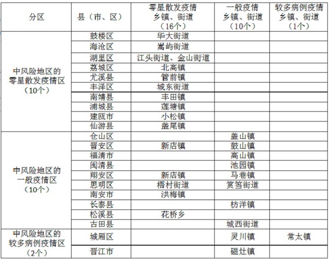 確保防控措施精准落實,將中風險地區以縣域為單位,分為零星散發疫情區、一般疫情區、較多病例疫情區三類。在此基礎上,再以鄉鎮、街道為單位,劃分四種,一是參照低風險地區管理的鄉鎮、街道(無確診病例,或連續14天無新增確診病例)﹔二是零星散發疫情鄉鎮、街道(無涉及本地感染的聚集性疫情且確診病例4例及以下)﹔三是一般疫情鄉鎮、街道(確診病例5—9例或發生1—3起涉及本地感染的聚集性疫情)﹔四是較多病例疫情鄉鎮、街道(確診病例10-50例或發生4起及以上涉及本地感染的聚集性疫情或累計確診病例超過50例,14天內未發生聚集性疫情)。具體名單見下表。