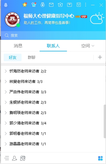 3月12日,為更好滿足廣大學生個性化、多元化心理服務需求,福建師范大學心理健康指導中心啟動遠程心理咨詢服務,開通遠程心理咨詢服務平台(“福師大心理健康指導中心”),將面對面咨詢轉為QQ線上視頻咨詢。