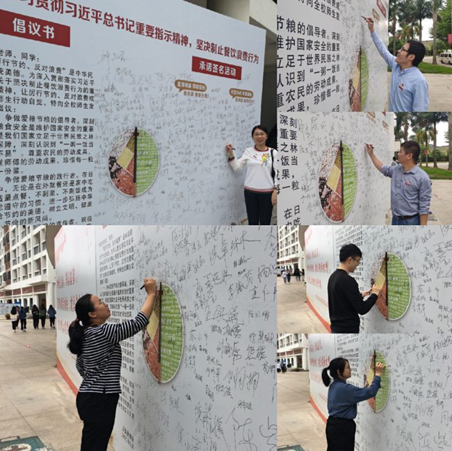 師生簽名承諾厲行節約珍惜糧食,用實際行動踐行光盤。米粒雖小,尤見禮義廉恥﹔節儉事微,可助興國安邦,我們要樹立珍惜糧食的意識,踐行愛惜糧食的理念。節約糧食,從我做起,從現在做起!