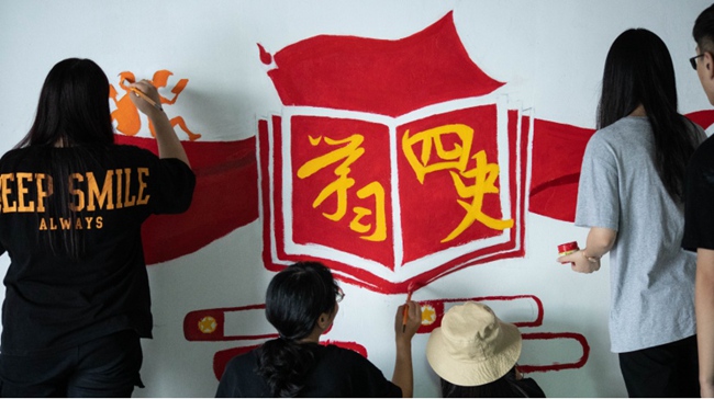 “黨旗的顏色可以更紅一點!”“這裡寫上‘四史’內容剛好合適!”藝術設計學院黨總支的師生們在正心樓和菲華教學樓開展“繪四史紅圖,守愛國初心”主題教育牆繪活動,他們用尺子、畫筆在牆壁上“各顯神通”,以豐富多彩的繪畫形式創作系列牆繪,把一面面白牆變成了師生學習“四史”的陣地牆。