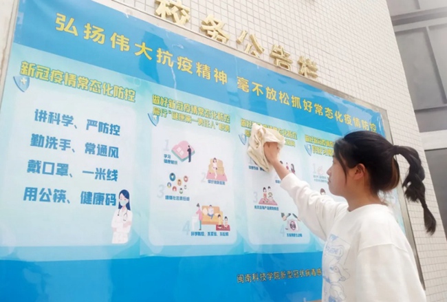 在閩南科技學院,健康衛生知識普及、勞動教育無處不在,宿舍、食堂、教室、圖書館等,都是同學們參與勞動實踐的場所。學校圍繞“防疫有我 愛衛同行”主題,通過召開一次動員部署會、開展一次環境衛生專項整治、建立一個衛生督導常態化機制、進行一次公共衛生設施大排查、開展一次全面消殺活動等“五個一”舉措,深入推進新時代校園愛國衛生運動環境衛生專項整治、公共區域大掃除大消毒、預防疾病宣傳教育等各項工作,把愛國衛生運動與培育家國情懷融合起來,與創建文明校園結合起來,與日常行為習慣培養聯合起來,培育師生健康、文明、綠色的生活習慣,筑牢校園常態化疫情防控體系。