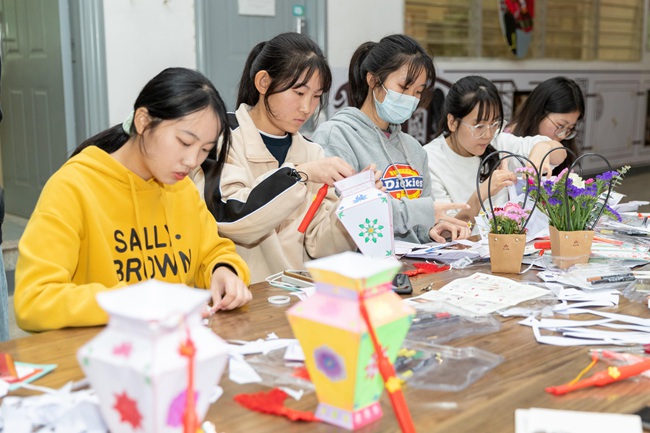 學生們專注地參與到傳統插花藝術和花燈制作中。 泉州職業技術大學供圖
