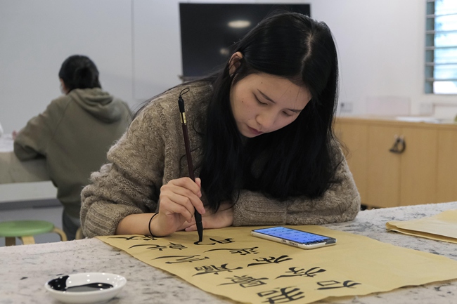 泉州職業技術大學通識教育目前設有金蒼繡、剪紙、陶藝、花燈等非遺大師工作室,實施非遺傳習教學。當天,發揮美育教育作用的藝術工坊同期開放,大家可以在此體驗書法、繪畫、沙畫等。