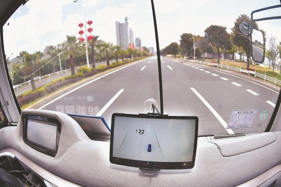 21日,記者試乘5G智慧公交車。 記者 林輝攝