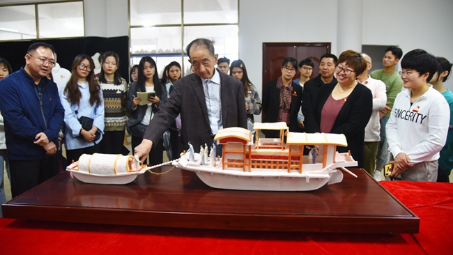 4月19日,在福建泉州德化縣鳳凰陶瓷雕塑研究所裡,泉州工藝美術職業學院師生們圍成一圈,認真聆聽中國陶瓷藝術大師、第一批國家級非物質文化遺產項目德化瓷燒制技藝代表性傳承人、中國工藝美術終身成就獎獲得者邱雙炯講解陶瓷作品《紅船》的設計思路及創作歷程。