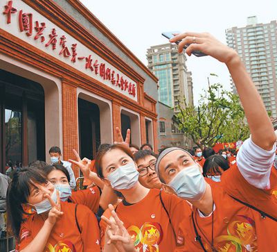 5月4日,在中共一大紀念館國旗廣場,參加五四主題集會的青年們在自拍合影。新華社記者 劉 穎攝