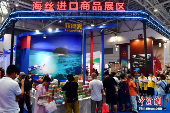 圖為觀眾在海絲進口商品展區菲律賓展位了解相關產品。 張斌 攝