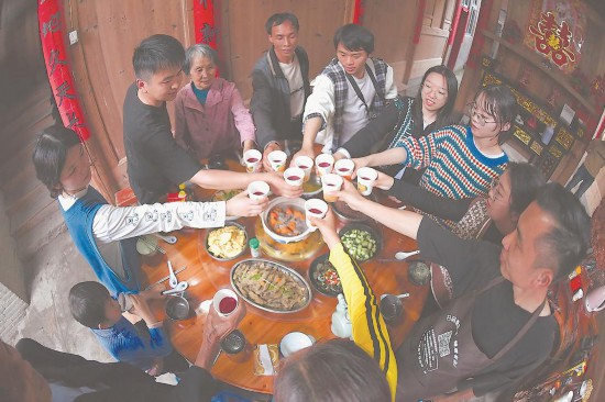 在屏城鄉前汾溪村,中國美術學院的學生和當地村民一起享用晚餐,不是一家人,勝似一家人。這是“今晚吃什麼”藝術實踐項目的重頭戲。在一些農村,因為青壯年大多外出創業或打工,一家人其樂融融的場景已不多見。