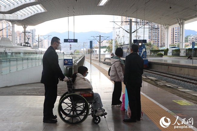 人民網福州1月31日電 (錢嘉禾、實習生方子晗)“嗚——”一聲冗長的汽笛聲鳴后,動車組緩緩進站了。黃昏的站台中,一位坐在輪椅上的小姑娘,正和父母一起,等待著這趟歸鄉的列車。