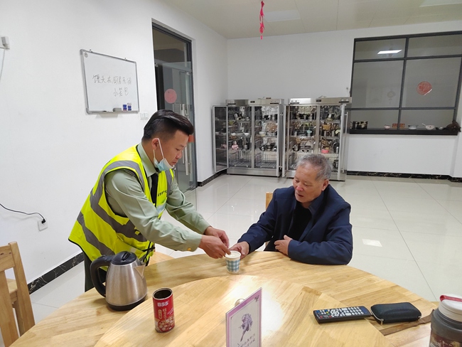老人隻會說連江話,言語溝通困難。經詢問,得知老人上午9點出發去女兒家,卻迷失方向,且一天未進食了。問及住址和家人電話時,老人直搖頭。在採取疫情防控措施后,鞠連華將老人家帶到食堂提供了熱水、面條。