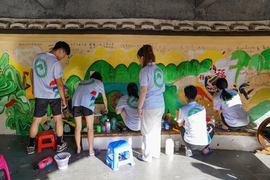在坪水村內,實踐隊成員精心設計具有畬族特色的圖案,積極做好繪畫准備,勾畫整體輪廓框架,全面填充涂抹裝飾。實踐隊成員將自己所學內容的專業知識充分融入到實踐活動中,在民族團結牆中展示了錯落有致的畬族村寨、象征吉祥的畬族鳳凰服、畬族特有的“福”字等。濃郁的畬族文化氣息扑面而來,村容村貌煥然一新。繪畫過程中還邀請畬族兒童共同參與,促進了隊員們民族團結的理解,也在畬族兒童心中埋下共促團結的種子。
