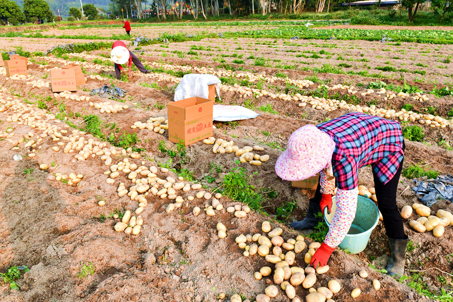 村民們將收獲的土豆裝箱打包。夏海濱攝