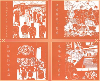 將主題創作與主題宣傳相結合,是柘榮剪紙的又一創新方向。“四下基層”與新時代黨的群眾路線理論研討會召開前夕,柘榮縣委宣傳部召集10位柘榮剪紙省級、市級、縣級非遺代表性傳承人,歷時半個月,分別以“宣傳黨的路線、方針、政策下基層”“調查研究下基層”“信訪接待下基層”“現場辦公下基層”為主題,共同完成4幅剪紙作品的創作、剪制和裝裱。作品通過朴實細膩的藝術語言,生動展現“四下基層”工作制度在寧德的堅持和傳承,彰顯黨員干部下基層、解民憂、辦實事、促發展的優良作風,成為推動“四下基層”大眾化傳播的新媒介。