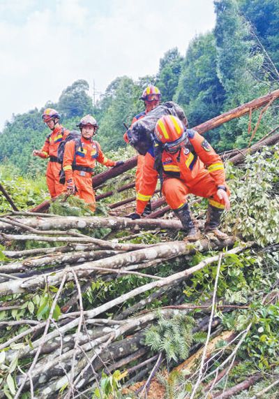 6月19日,福建省龍岩市消防救援支隊救援人員從武平縣下壩鄉衛生院徒步4個多小時,趕赴美溪村救災。