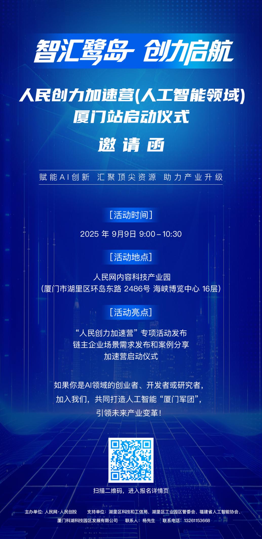 “人民創力加速營”自今年4月啟動以來,已陸續在多地及高校舉辦各類活動。值第二十五屆中國國際投資貿易洽談會舉辦之際,為推動產業與資本雙向賦能,人民創投計劃在廈門市湖裡區舉辦“人民創力加速營(人工智能領域)”項目啟動儀式,活動中將正式對外發布入營企業招募,並擇期開營。可掃描下方海報二維碼了解詳情。(人民創投)