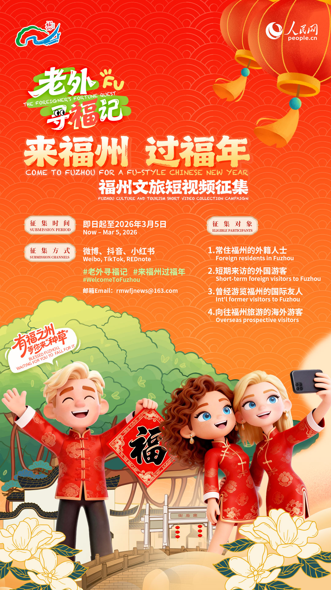 人民網福州1月29日電 (歐煒)有福之州,溫暖榕城!福州的“福”氣,不止藏在三坊七巷的青石板裡,不止泡在魚丸肉燕的滾燙湯頭中,也藏在每一位外國朋友驚喜的眼眸裡。即日起至2026年3月5日,福州市文化和旅游局聯合人民網推出“來福州,過福年”福州文旅短視頻征集活動,向所有與福州結緣的國際友人發出盛情邀約。