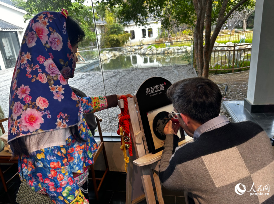 外國專家體驗“石上刺繡”。人民網記者 張萌攝