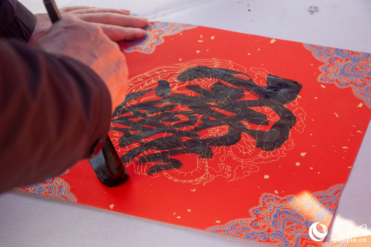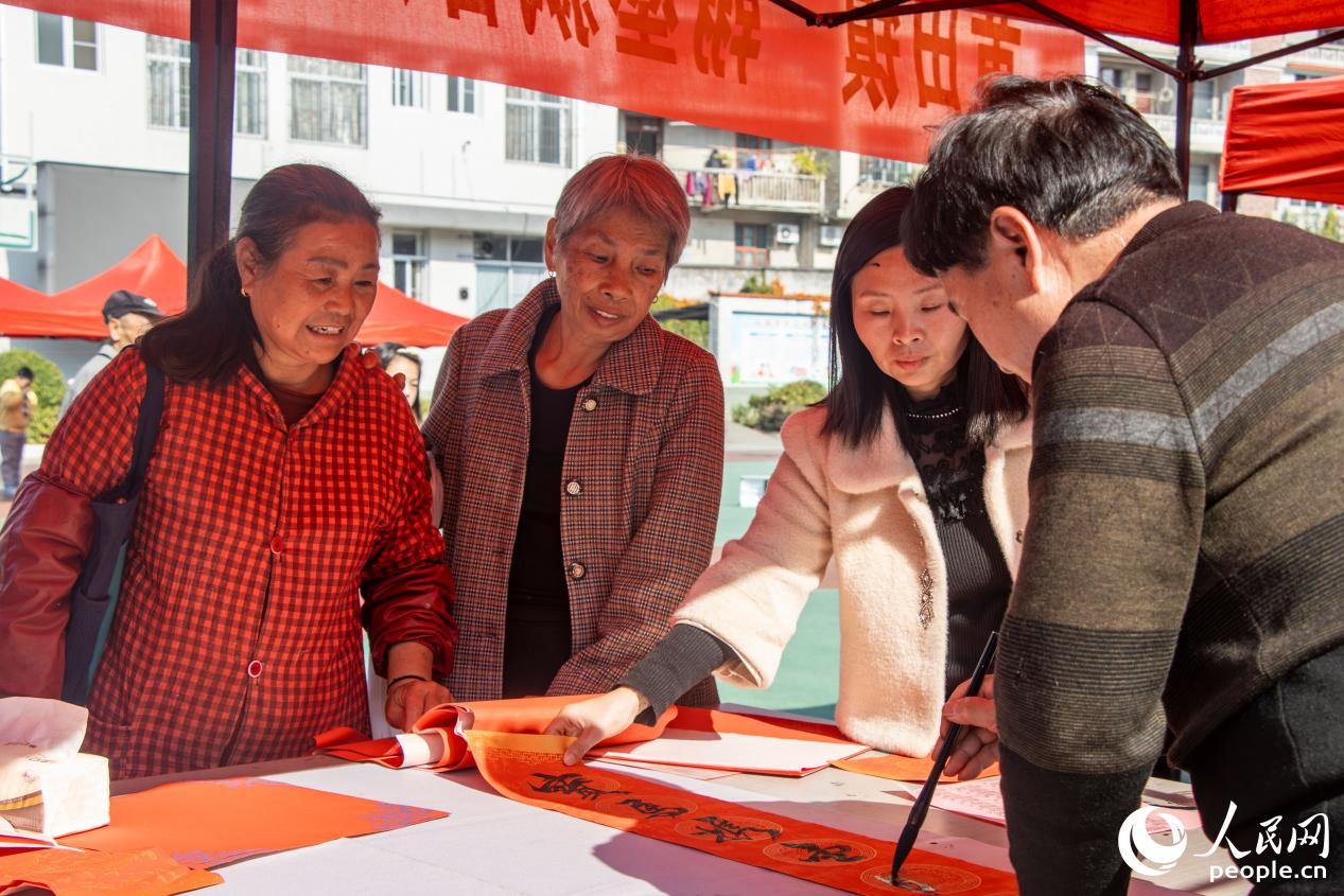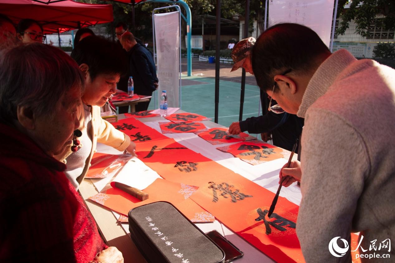 書法家正在為當地居民題寫春聯。人民網 林銘賢攝