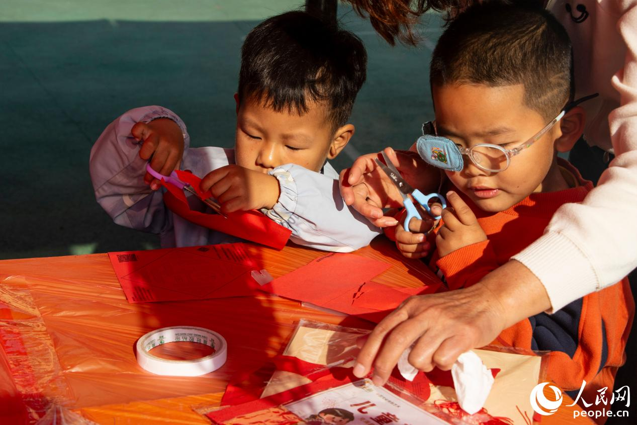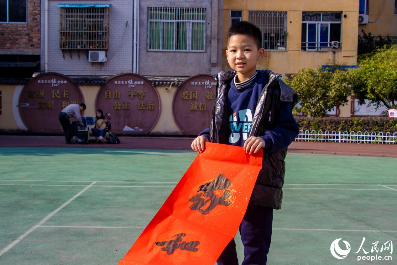 小朋友向鏡頭展示春聯。人民網 林銘賢攝