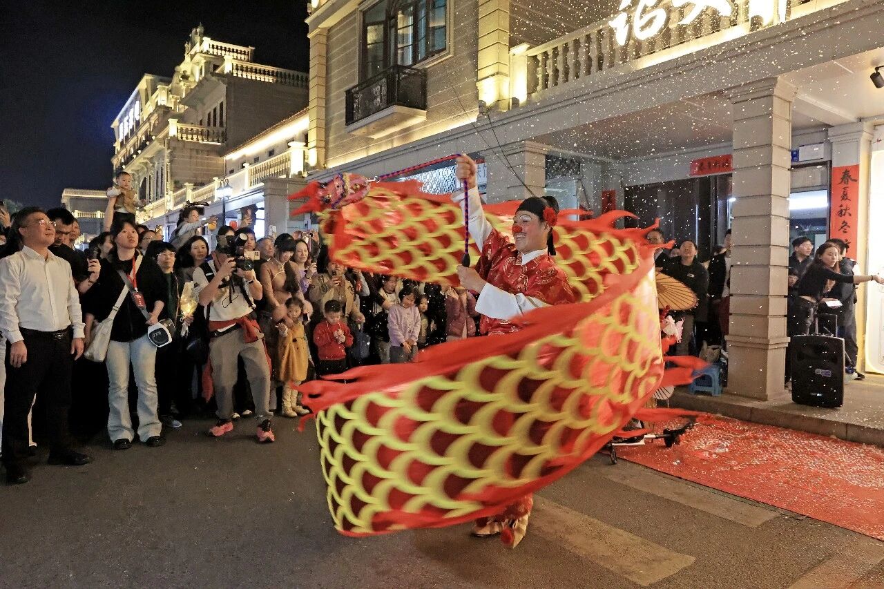 夜幕降臨,古城的熱鬧絲毫未減,反而被光影與歌聲裝點得更加迷人。騎樓幻境光影秀將百年騎樓的牆面化作流動的畫布,五彩斑斕的光影如夢境般變幻流轉,電音福娃踏著歡快的節拍,引得游客們紛紛舉起手機,定格這夢幻的一刻。抬頭望去,天台音樂趴的旋律隨風飄蕩,街頭雜耍表演的喝彩聲、飄雪秀下的歡呼聲交織成動人的夜之樂章。年輕人揮舞著熒光棒,沉浸在這座“不夜城”的獨特魅力中,享受著視聽感官的全面滿足。今年春節期間,詔安古城核心打卡地累計接待游客41萬人次,比增469.27%。