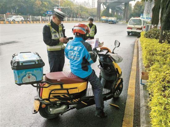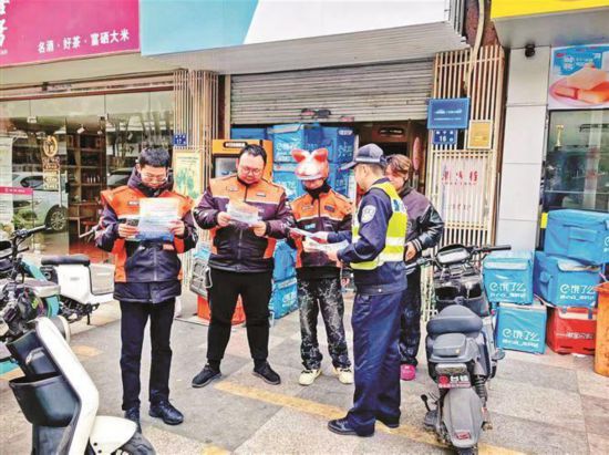 在路面一線,交警向外賣騎手發放交通安全宣傳資料。