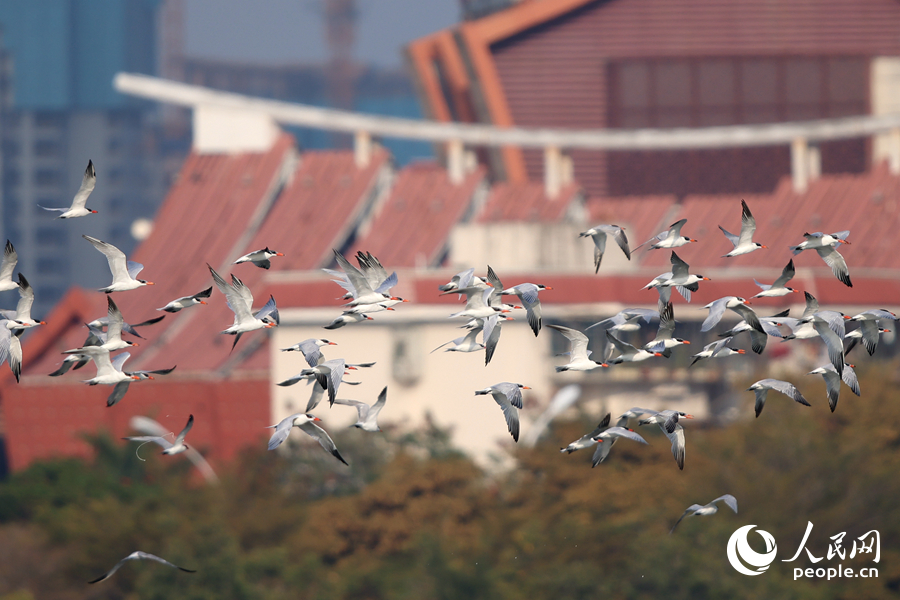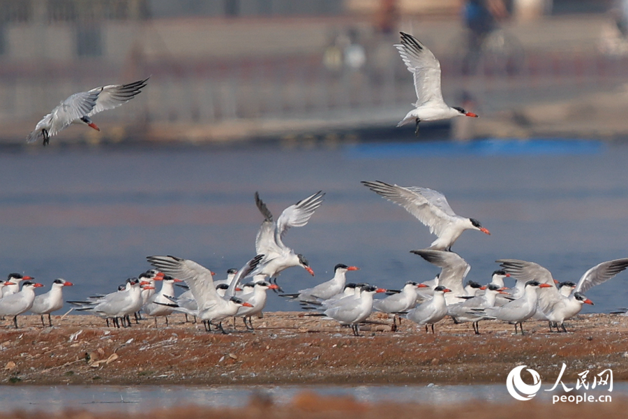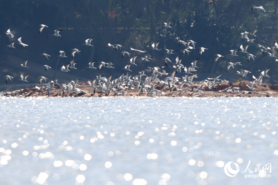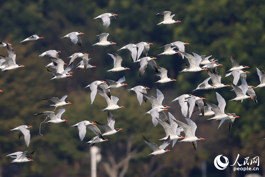 成群紅嘴巨燕鷗現身集美杏林灣水域。人民網記者 陳博攝