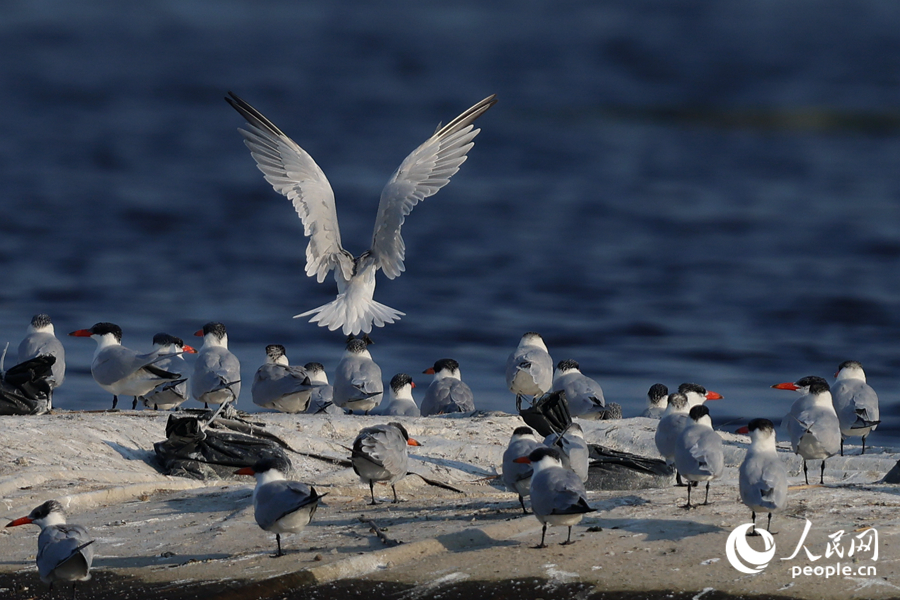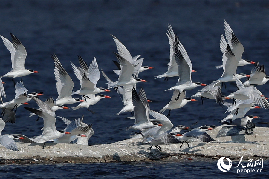 紅嘴巨燕鷗起飛瞬間。人民網記者 陳博攝
