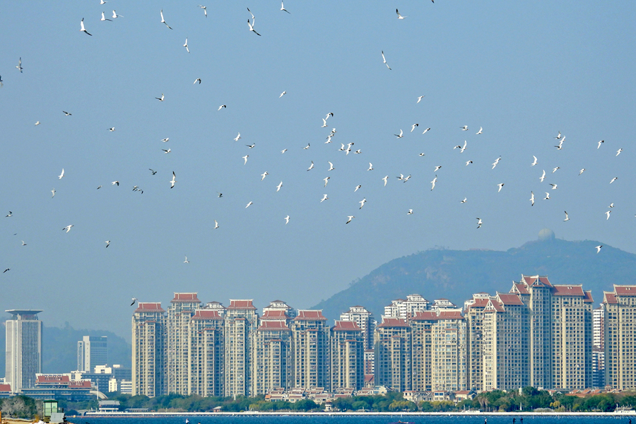 鳥群與杏林灣畔的嘉庚特色建筑相映成趣。人民網記者 陳博攝
