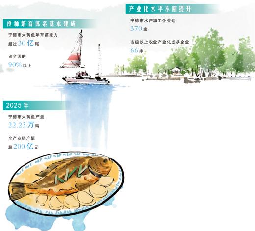 從2016年開始,寧德推動高校科研團隊與龍頭企業強強聯手,擦亮大黃魚種業創新的“金招牌”。二年齡養成魚的體重從2000年的平均350克提高到目前的600克﹔先后培育出大黃魚“富發1號”等新品種,選育了“寧抗1號”“寧抗2號”等大黃魚抗病新品系……如今,寧德市大黃魚良種繁育體系基本建成並不斷完善,年育苗能力超過30億尾,佔全國的90%以上。