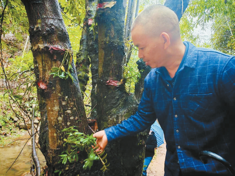 10月27日,在上杭县白砂镇和康共富林场的林下种植基地,嫩洋村村民罗昭辉正在查看骨碎补苗的生长情况。…