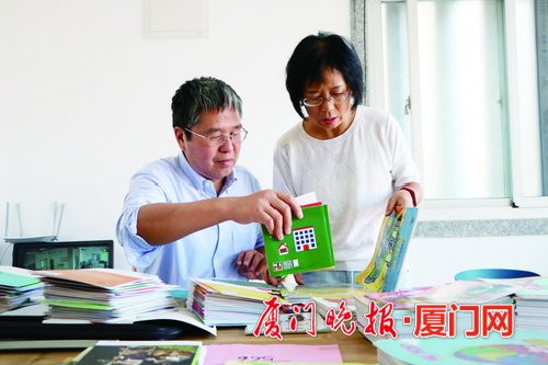厦大教师和妻子为农村孩子办起图书馆 义举在翔安沙美社区成为美谈 王宜强和鲁静如整理入库书籍。