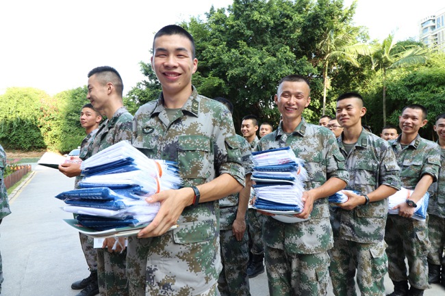 官兵们手捧坤驰出租车公司党员送来的背心。林林摄