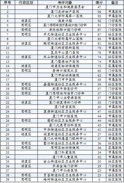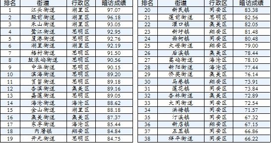 从各区得分情况来看,湖里区以96.98分的总分,排在全市六区第一位,思明区以93.26分的总分紧随其后,海沧区、翔安区、集美区、同安区分别排在第三、四、五、六位。