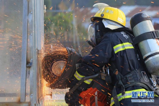 12月9日,在福建省龙岩市消防训练基地,消防员在进行切割破拆训练。新华社发(周杨东 摄)