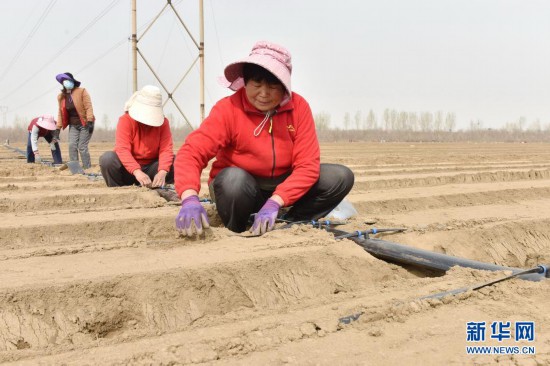 3月25日,河北省邢台市南和区三思镇南韩村农民在中药材种植田铺设滴灌管道。